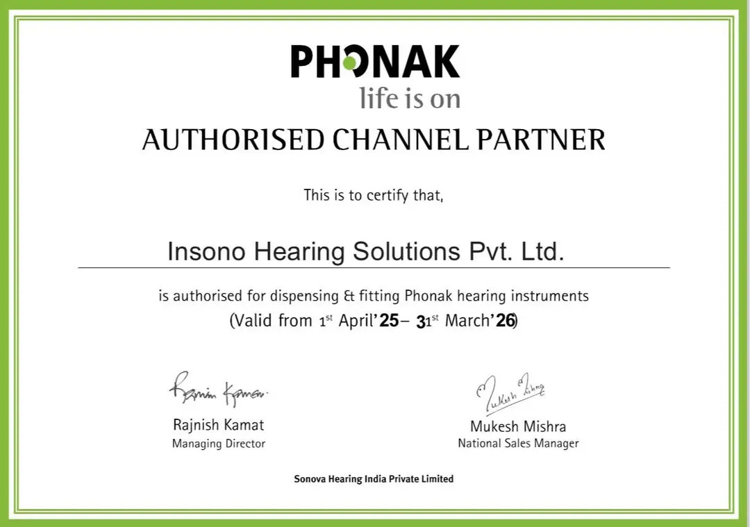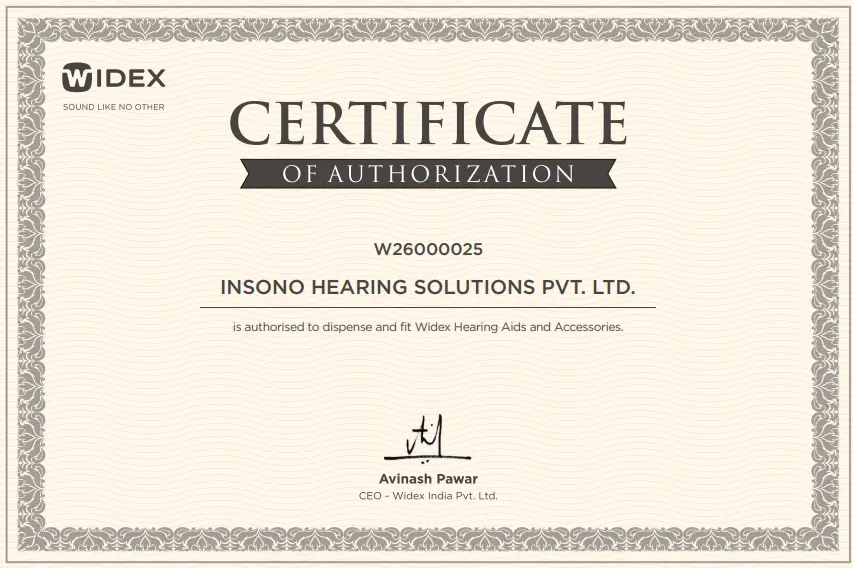 Insono Hearing Solutions is an authorized partner for leading global hearing aid brands including Widex, Signia, Phonak, and Oticon. These certifications reflect our trusted expertise and commitment to world-class hearing care in India.